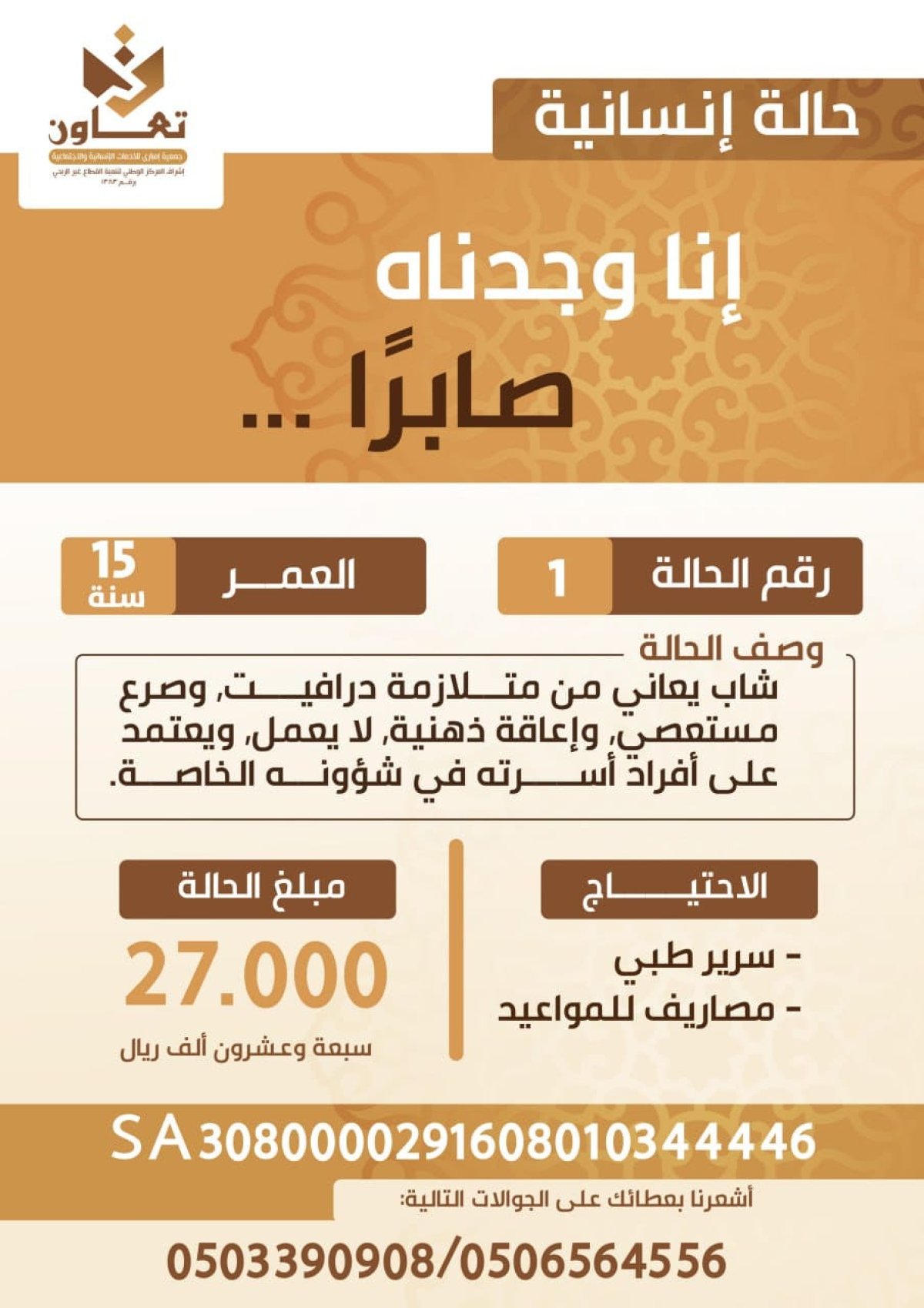ساهم أخي المسلم وشاركنا الأجر في اكتمال مبلغ هذه الحالة، وبادر بتفريج الكربة عن أخوانك المسلمين، الذين هم بحاجة ماسة إلى يد العون من الله ثم من إخوانهم.