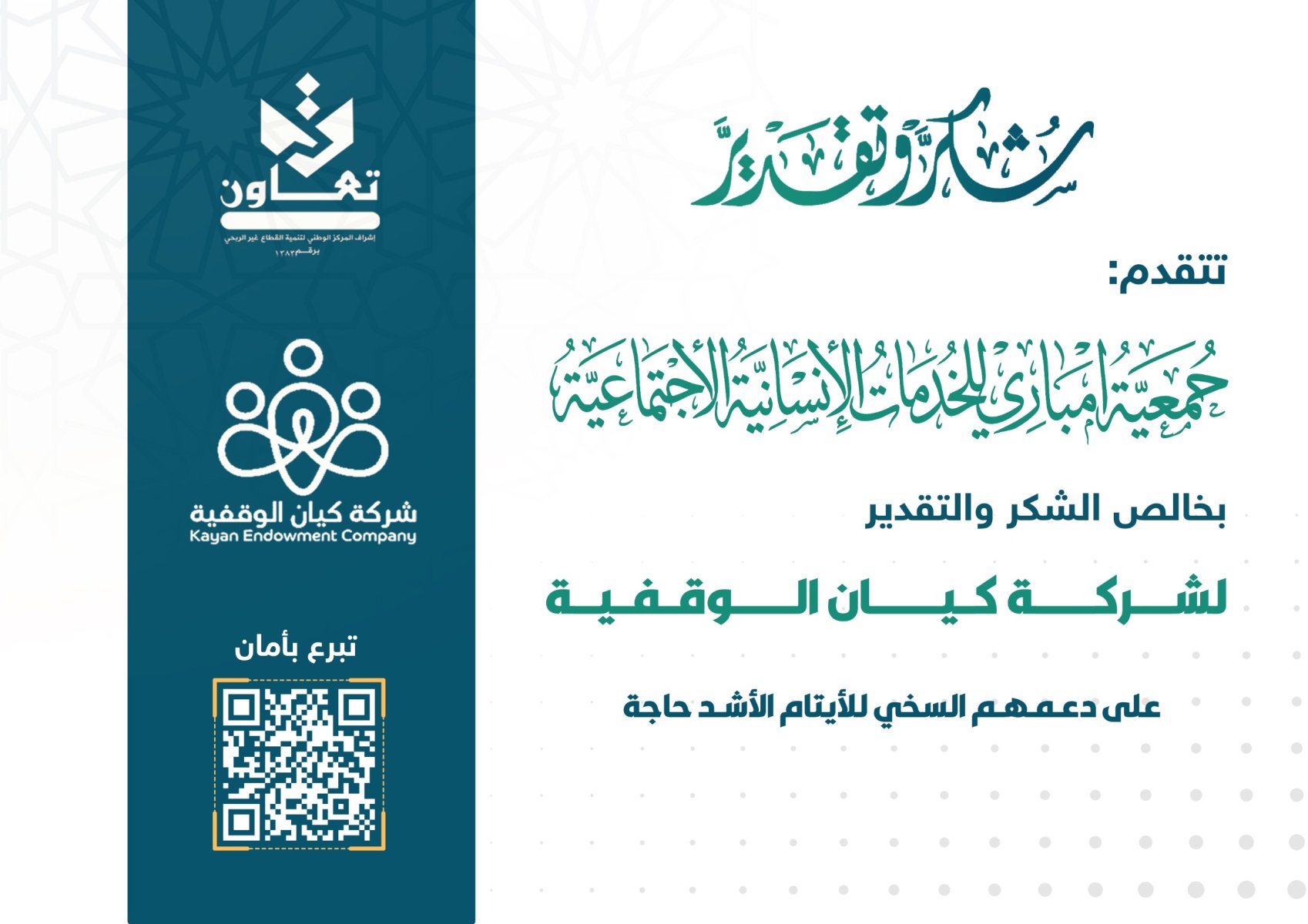 بأسمى آيات الشكر والعرفان لشركة كيان الوقفية على